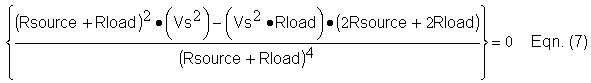 Holding Rsource constant, we take the derivative of this expression with respect to Rload. We then set it equal to zero to find a maximum (as Rload varies):